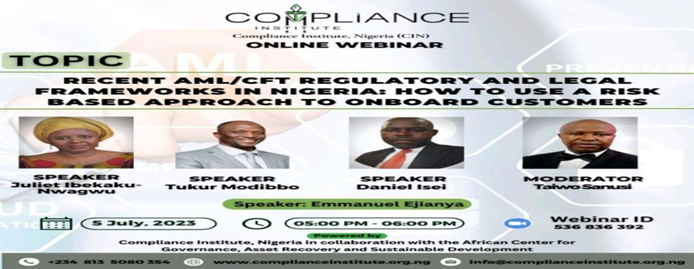 On 5 July 2023, the Compliance Institute of Nigeria (CIN) in collaboration with the African Center for Governance, held a webinar titled “Recent Anti-Money Laundering/Countering the Financing of Terrorism (AML/CFT) Regulatory and Legal Frameworks in Nigeria: How to Use a Risk-Based Approach to Onboard Customer”.