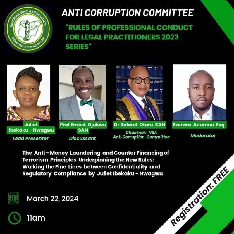 Speakers, including Dr. Roland Otaru, SAN, and Prof. Ernest Ojukwu, SAN, emphasized ethics, Know Your Customer (KYC), record-keeping, and risk-based reporting. The lead speaker, Juliet Ibekaku-Nwagwu, highlighted key RPC amendments, legal obligations, and the NBA Anti-Money Laundering Committee’s role in compliance.