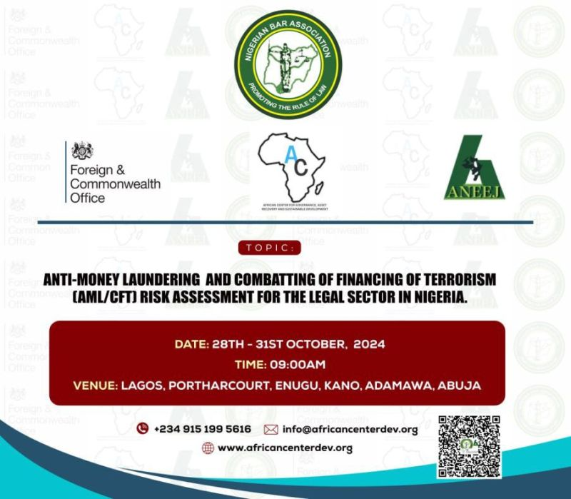 In collaboration with the NBA, the NBA Anti-Money Laundering Committee (NBA-AMLC) we held the AML/CFT Legal Sector Risk Assessment Workshops in Lagos, Abuja, Yola, Port Harcourt, Kano, and Enugu to strengthen lawyers’ ability to combat financial crime through a risk based assessment of possible ML/FT/PF risks. The workshop assessed ML/FT/PF risks through online questionnaires and in-person sessions from October 28 to 31.